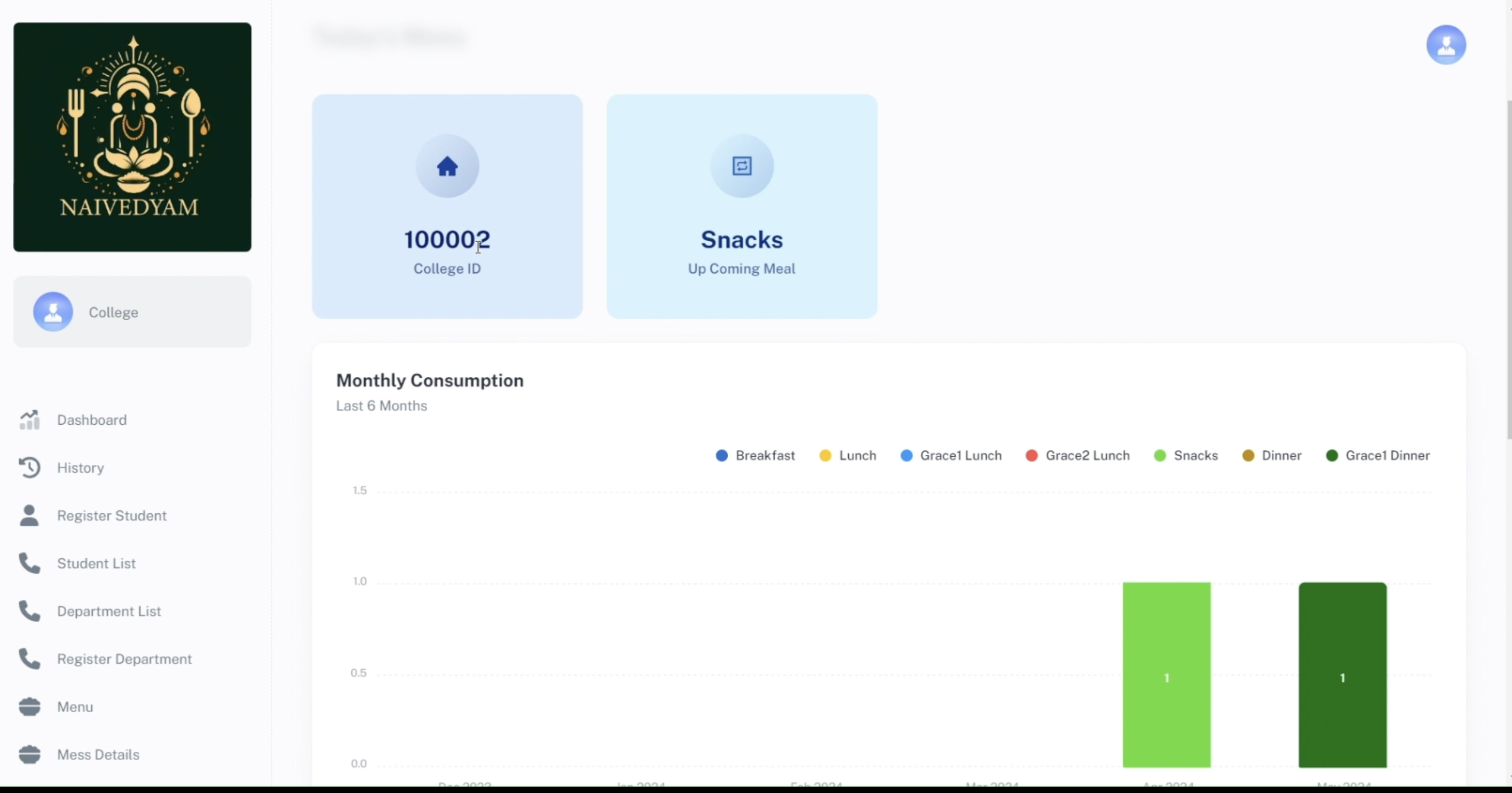 The college-side dashboard surfaces consumption analytics and operational modules like student lists, department setup, mess details, menu handling, and related management workflows.